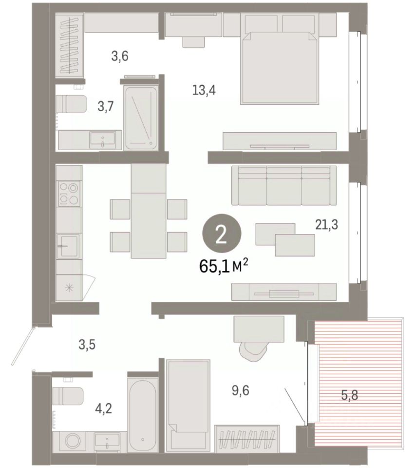 2-комн. квартира с предчистовой отделкой в Кварталы "На Минской" на 5 этаже. Общая площадь: 65.09 кв.м., жилая: 23 кв.м., площадь просторной кухни-гостиной: 21.3 кв.м. Комнаты изолированные, все окна выходят на одну сторону. В квартире одна лоджия, два совмещенных санузла. Высота потолков 2.7 м.