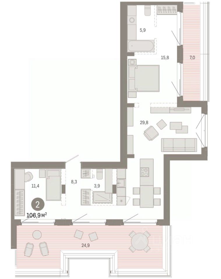 Квартира с кухней-гостиной и двумя спальнями в кварталах "На Минской". Особенности планировки: вид во двор, разнесённые спальни, предчистовая отделка, мастер-спальня, терраса на крыше.