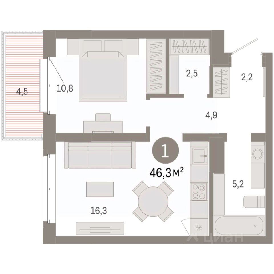 Однокомнатная квартира от застройщика с предчистовой отделкой в Кварталы "На Минской" на 3 этаже. Общая площадь: 46.33 кв.м., жилая: 10.8 кв.м., площадь просторной кухни-гостиной: 16.3 кв.м. Все окна выходят на одну сторону. В квартире один балкон, один совмещенный санузел. Высота потолков 2.7 м.