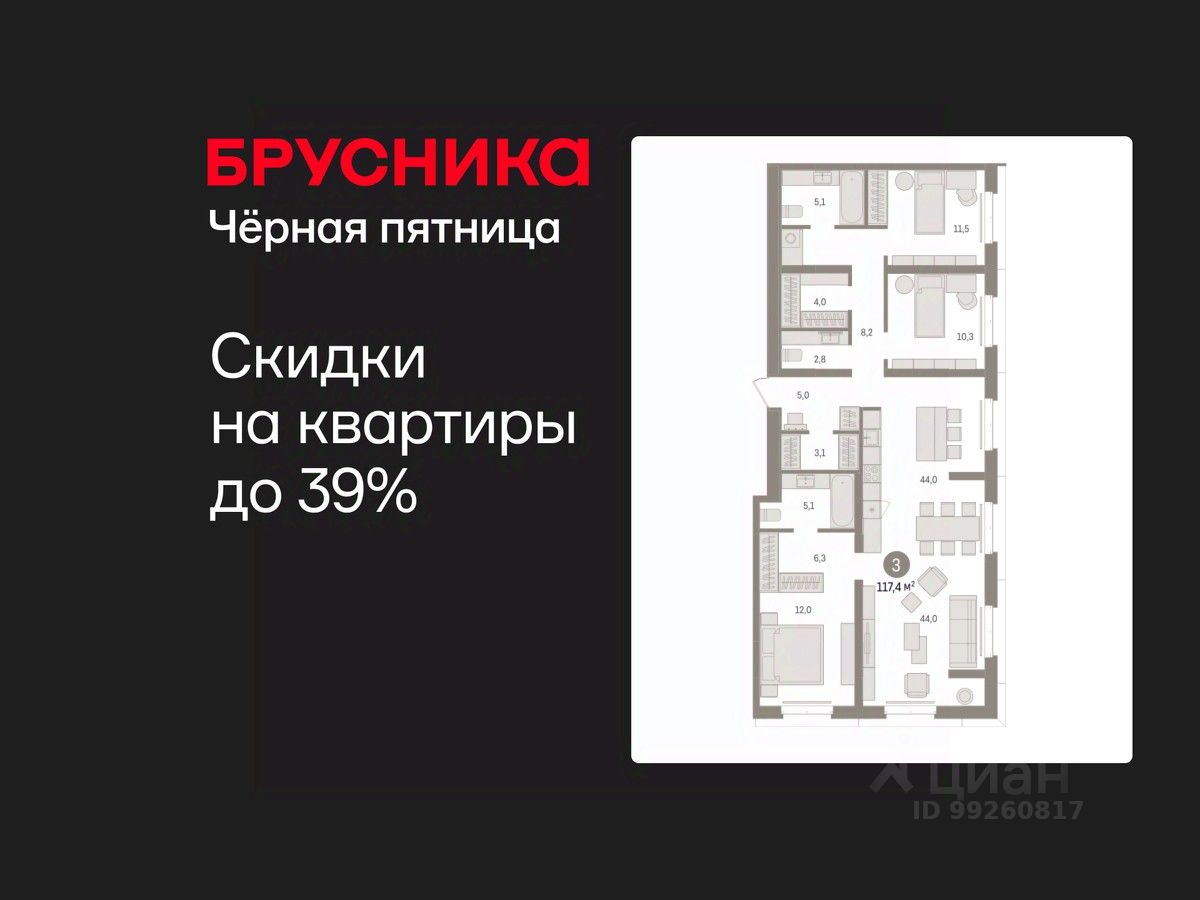 3-комн. квартира от застройщика с предчистовой отделкой в Кварталы "На Минской" на 2 этаже. Общая площадь: 117.35 кв.м. Высота потолков 2.7 м.