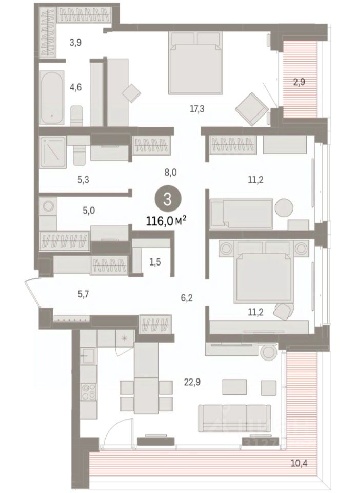 Квартира с кухней-гостиной и тремя спальнями в кварталах "На Минской". Особенности планировки: гардеробная, панорамное остекление, лоджия, предчистовая отделка, мастер-спальня, постирочная.