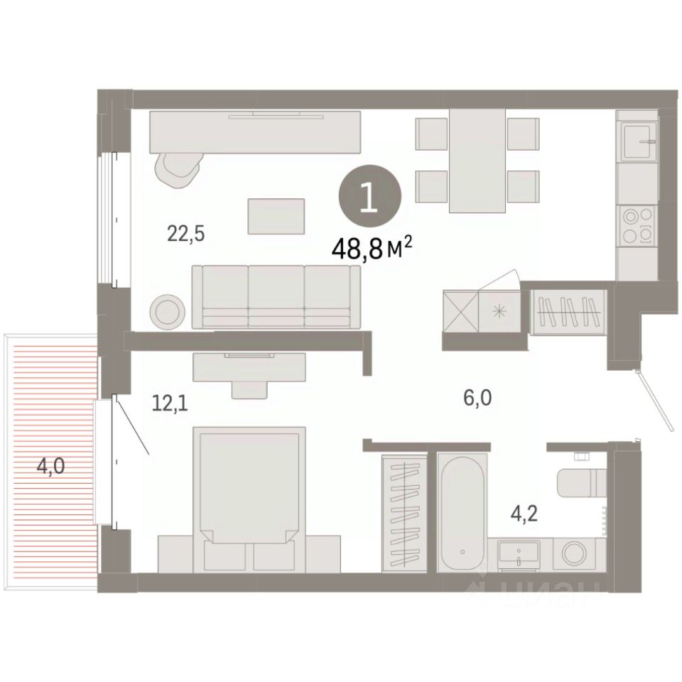 Просторная 1-комн. квартира с предчистовой отделкой в Кварталы "На Минской" на 6 этаже. Общая площадь: 48.77 кв.м., жилая: 12.1 кв.м., площадь просторной кухни-гостиной: 22.5 кв.м. Все окна выходят на одну сторону. В квартире один балкон, один совмещенный санузел. Высота потолков 2.7 м.