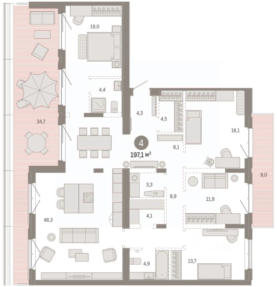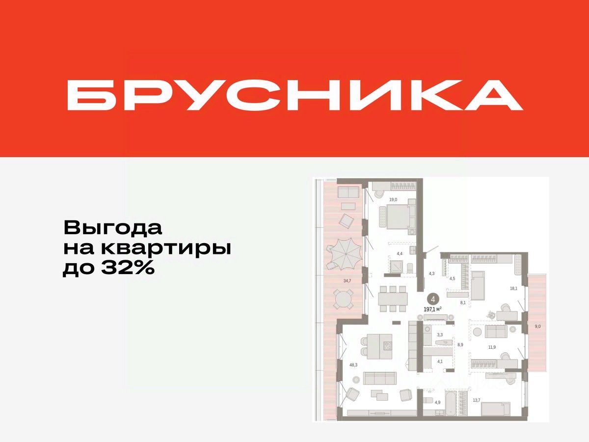 Квартира с кухней-гостиной и четырьмя спальнями в кварталах "На Минской". Особенности планировки: гардеробная, окна в пол, рабочий кабинет, вид во двор, разнесённые спальни, предчистовая отделка, мастер-спальня, постирочная, балкон, терраса на крыше.