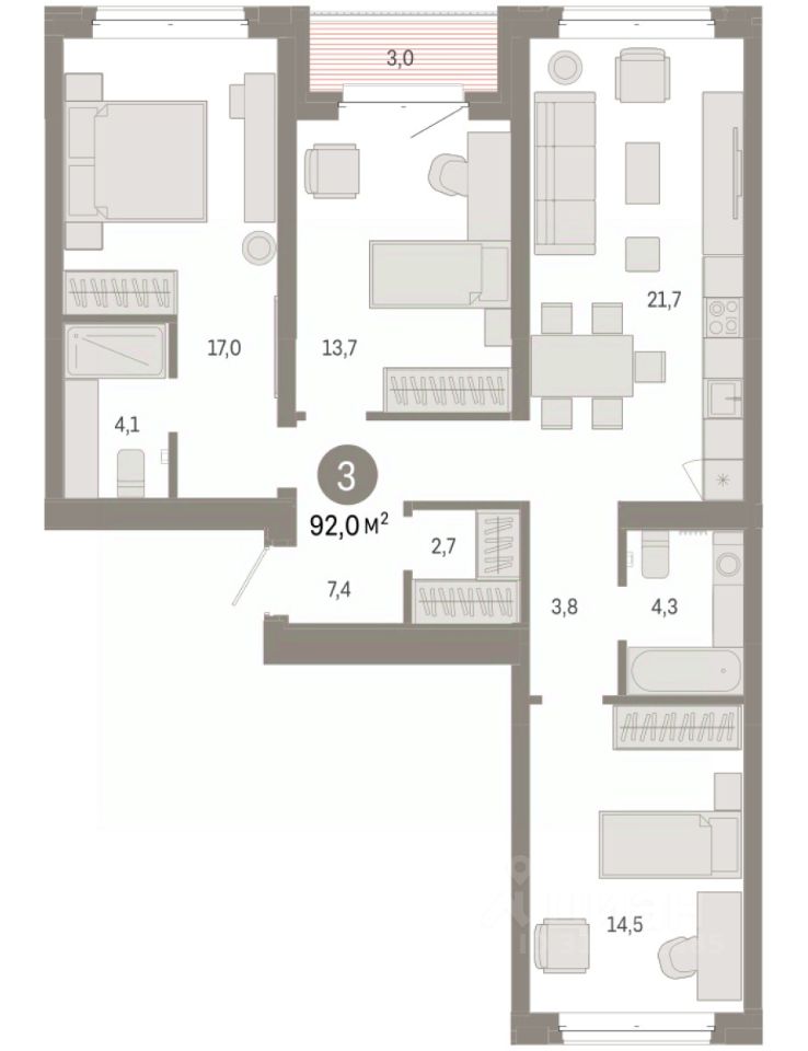 Квартира с кухней-гостиной и тремя спальнями в кварталах "На Минской". Особенности планировки: окна на две стороны, гардеробная, вид во двор, тёплая лоджия, разнесённые спальни, предчистовая отделка, мастер-спальня.
