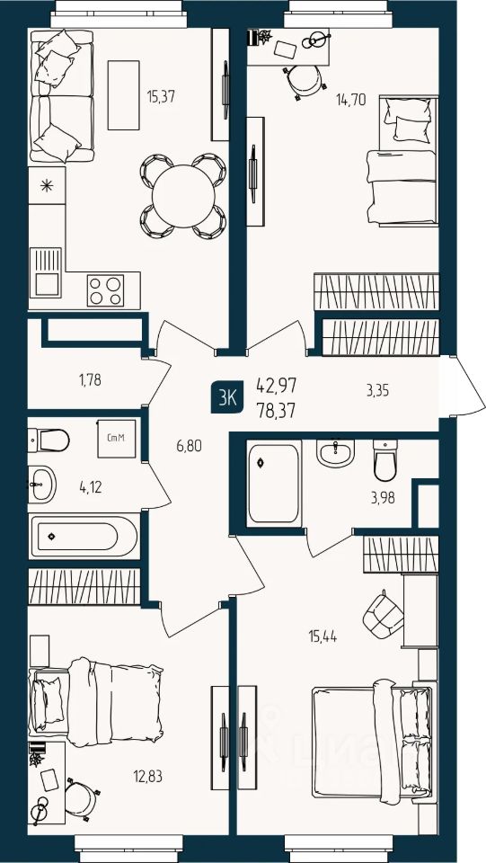 Продаётся 3-комнатная квартира в строящемся доме (Дом Семейный (ГП-3)), срок сдачи: III-кв. 2027, общей площадью 78.37 кв.м., на 4 этаже. Новый жилой комплекс "Квартал Мятный" от Специализированного застройщика "Юпитер" расположен по адресу: г. Тюмень по ул. Кулибина.