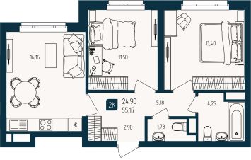 Продаётся 2-комнатная квартира в строящемся доме (Дом Семейный (ГП-3)), срок сдачи: III-кв. 2027, общей площадью 55.17 кв.м., на 7 этаже. Новый жилой комплекс "Квартал Мятный" от Специализированного застройщика "Юпитер" расположен по адресу: г. Тюмень по ул. Кулибина.