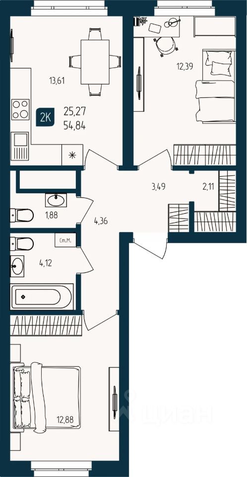 Продаётся 2-комнатная квартира в строящемся доме (Дом Каскад (ГП-2)), срок сдачи: III-кв. 2027, общей площадью 54.84 кв.м., на 10 этаже. Новый жилой комплекс "Квартал Мятный" от Специализированного застройщика "Юпитер" расположен по адресу: г. Тюмень по ул. Кулибина.