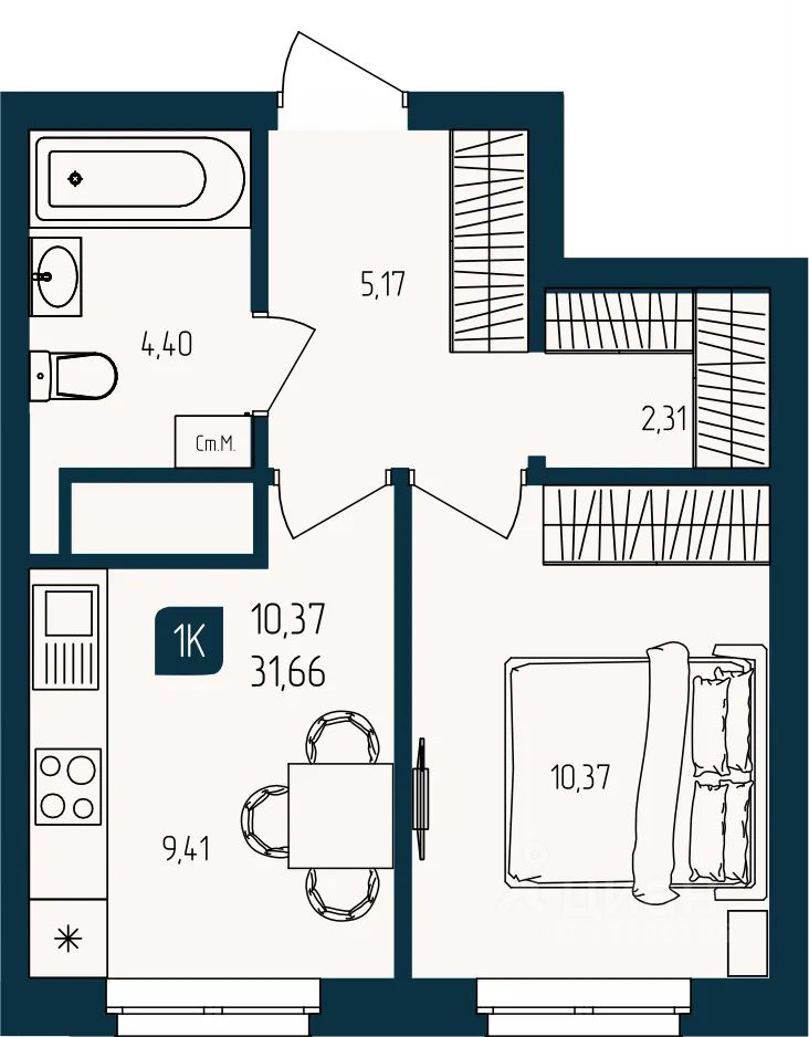 Продаётся 1-комнатная квартира в строящемся доме (Дом Каскад (ГП-2)), срок сдачи: III-кв. 2027, общей площадью 31.66 кв.м., на 20 этаже. Новый жилой комплекс "Квартал Мятный" от Специализированного застройщика "Юпитер" расположен по адресу: г. Тюмень по ул. Кулибина.