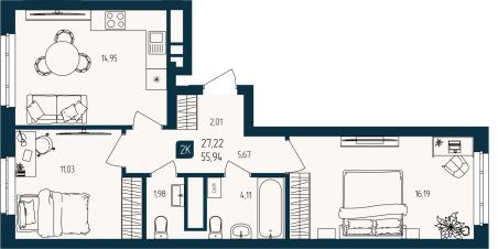 Продаётся 2-комнатная квартира в строящемся доме (Дом Каскад (ГП-2)), срок сдачи: III-кв. 2027, общей площадью 55.94 кв.м., на 16 этаже. Новый жилой комплекс "Квартал Мятный" от Специализированного застройщика "Юпитер" расположен по адресу: г. Тюмень по ул. Кулибина.