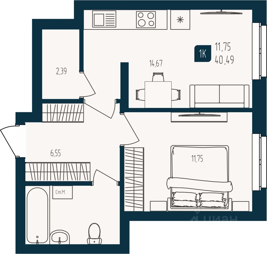 Продаётся 1-комнатная квартира в строящемся доме (Дом Башня (ГП-1)), срок сдачи: III-кв. 2027, общей площадью 40.49 кв.м., на 1 этаже. Новый жилой комплекс "Квартал Мятный" от Специализированного застройщика "Юпитер" расположен по адресу: г. Тюмень по ул. Кулибина.