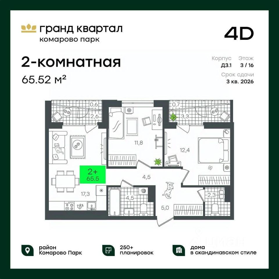 Продаётся 2-комнатная квартира в строящемся доме (1-Д3.1 (Глебова, 10)), срок сдачи: III-кв. 2026, общей площадью 65.52 кв.м., на 10 этаже. Компания 4D приступила к строительству нового жилого комплекса "Гранд квартал". Новый ЖК находится в зеленой зоне Калининского района, южнее микрорайона Тюменская слобода.