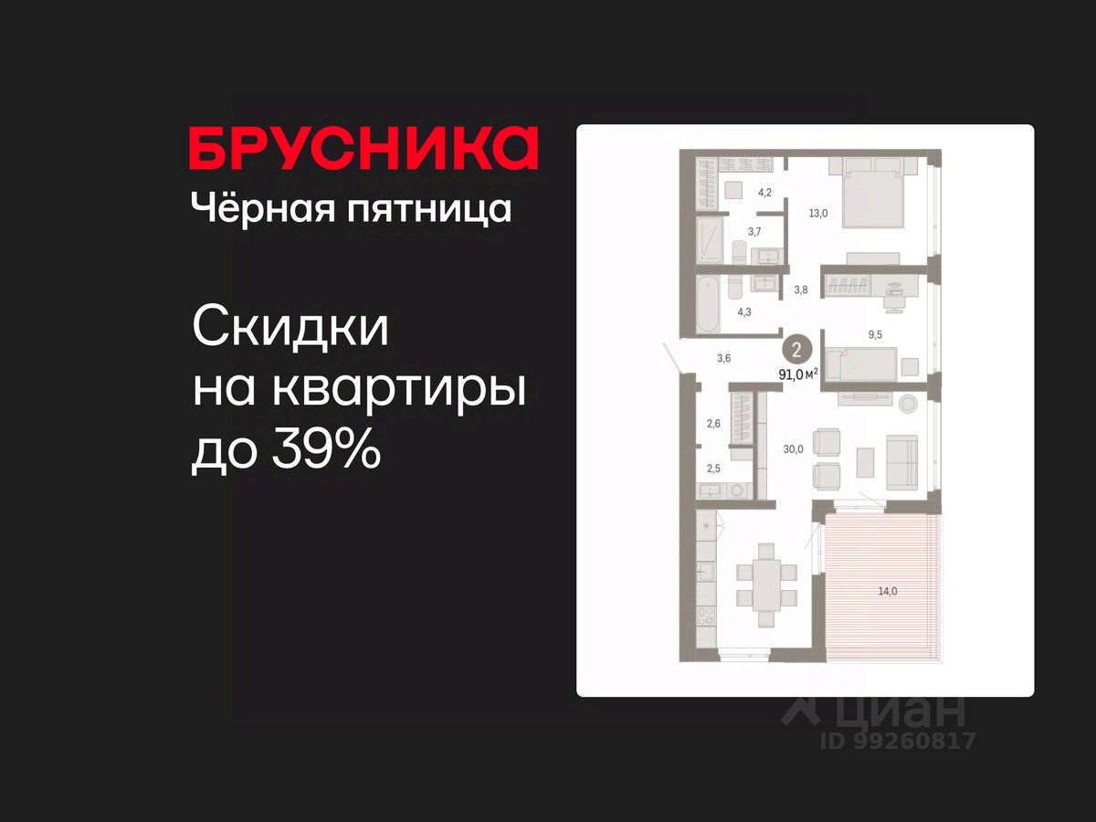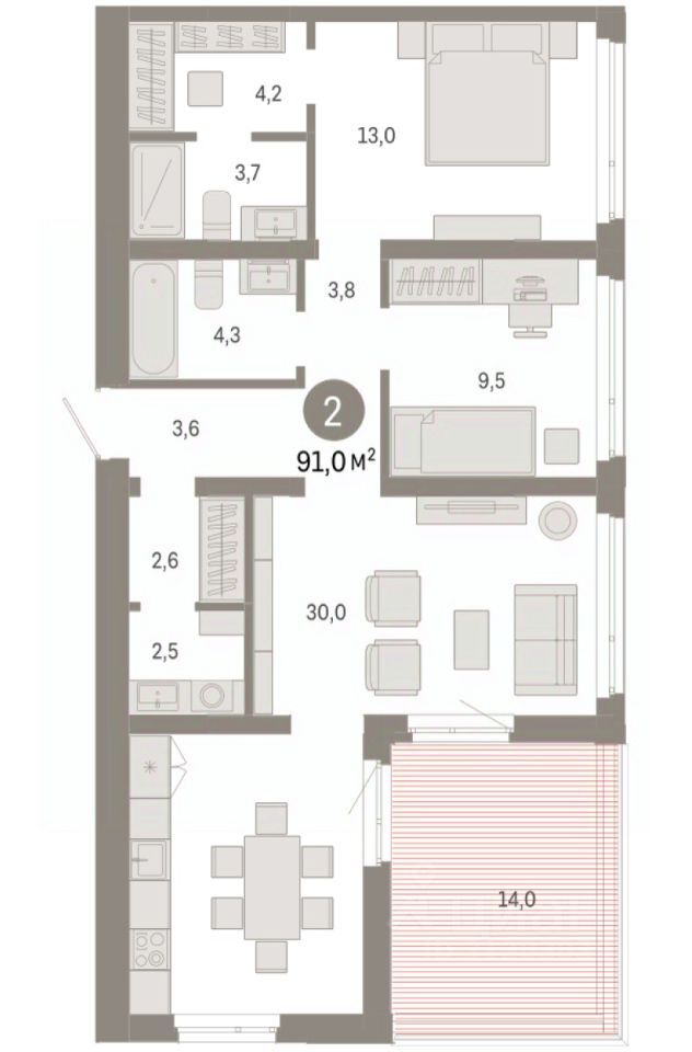 Просторная 2-комн. квартира с предчистовой отделкой в ЖК "Республики 205" на 9 этаже. Общая площадь: 90.99 кв.м. Высота потолков 2.7 м.