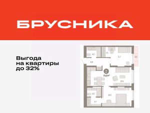 Квартира с кухней-гостиной и двумя спальнями в Октябрьском на Туре. Особенности планировки: гардеробная, вид во двор, разнесённые спальни, предчистовая отделка, мастер-спальня, балкон.