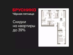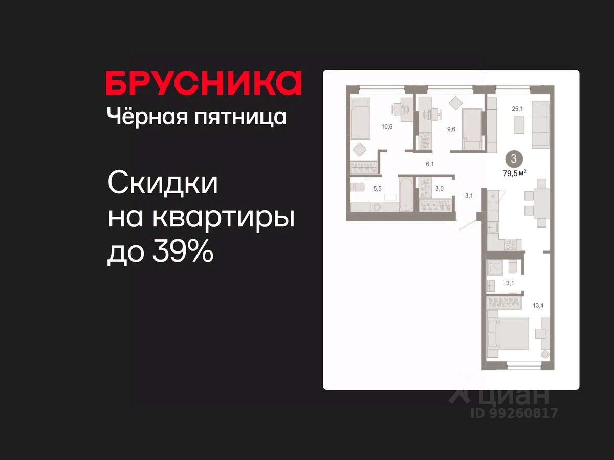 Квартира с кухней-гостиной и тремя спальнями в Октябрьском на Туре. Особенности планировки: гардеробная, вид во двор, разнесённые спальни, предчистовая отделка, мастер-спальня.