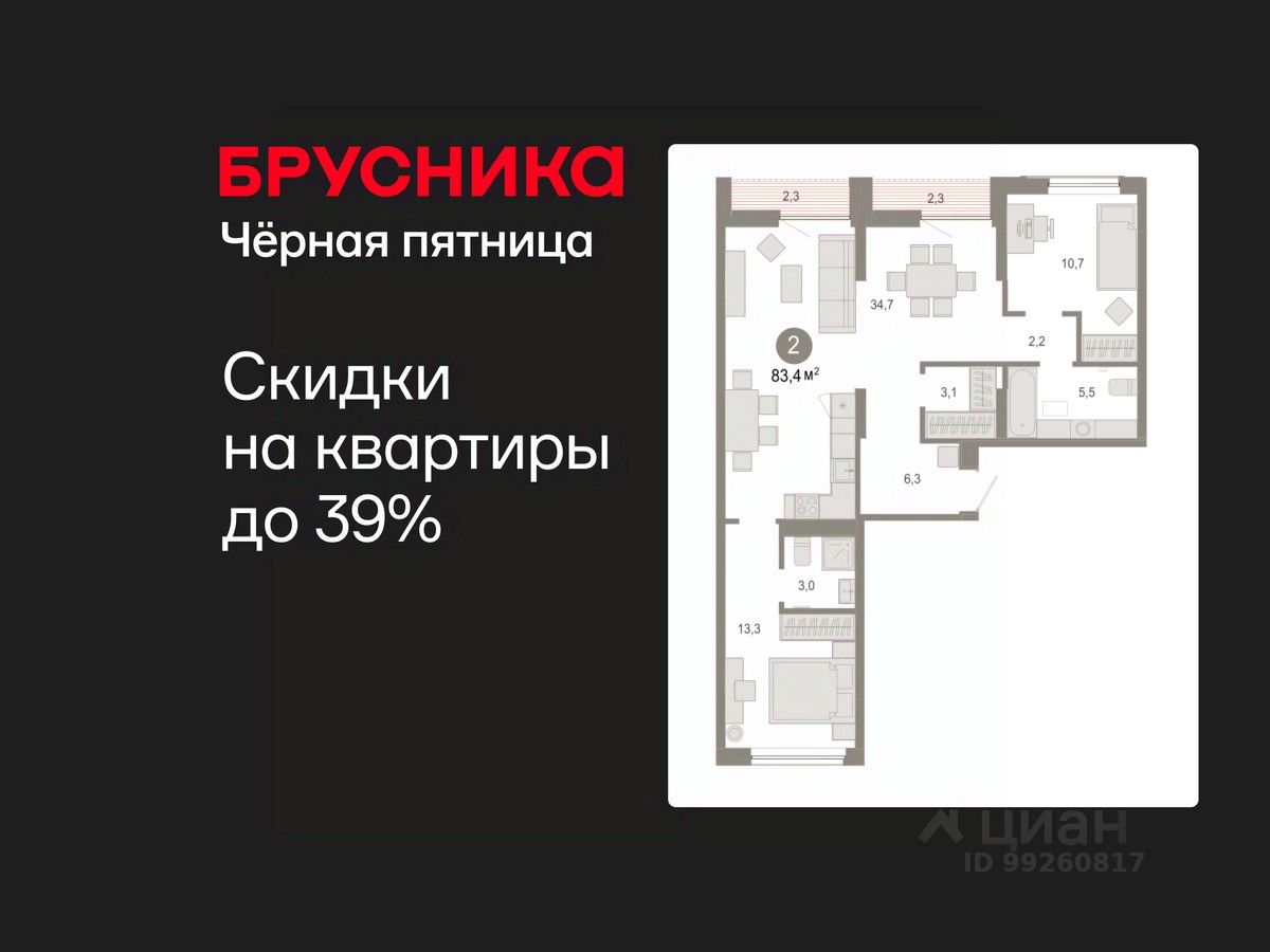 Квартира с кухней-гостиной и двумя спальнями в Октябрьском на Туре. Особенности планировки: гардеробная, вид во двор, лоджия, разнесённые спальни, предчистовая отделка, мастер-спальня.