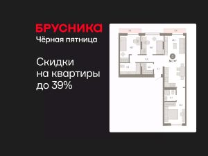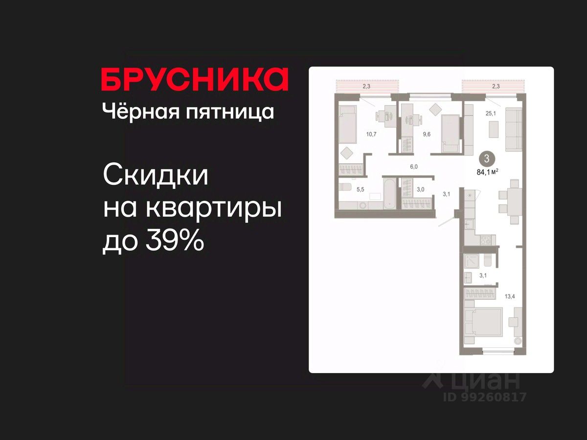 Квартира с кухней-гостиной и тремя спальнями в Октябрьском на Туре. Особенности планировки: гардеробная, вид во двор, разнесённые спальни, предчистовая отделка, мастер-спальня, балкон.