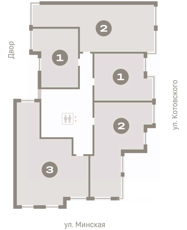 Квартира с кухней-гостиной и тремя спальнями в кварталах "На Минской". Особенности планировки: окна на две стороны, гардеробная, окна в пол, окно в санузле, панорамное остекление, разнесённые спальни, предчистовая отделка, мастер-спальня, балкон.