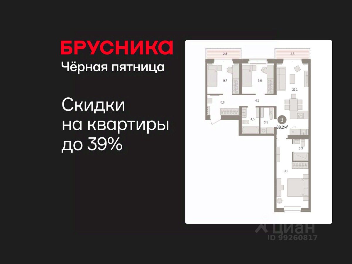 Квартира с кухней-гостиной и тремя спальнями в кварталах "На Минской". Особенности планировки: панорамное остекление, разнесённые спальни, предчистовая отделка, мастер-спальня, постирочная, балкон.
