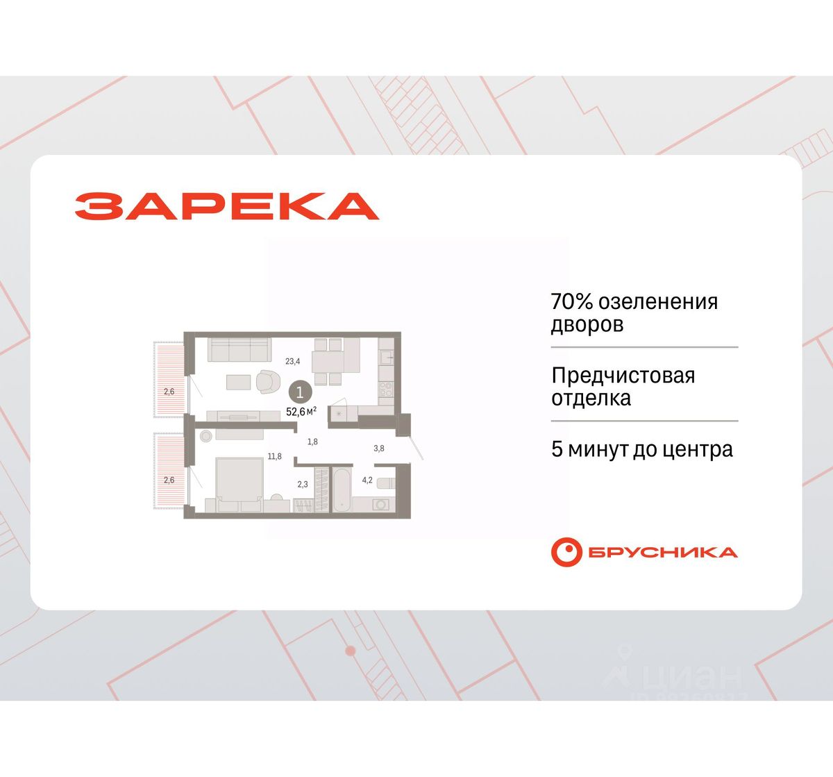 Однокомнатная квартира от застройщика с предчистовой отделкой в ЖК "Зарека" на 9 этаже. Общая площадь: 52.62 кв.м., жилая: 11.8 кв.м., площадь просторной кухни-гостиной: 23.4 кв.м. Все окна выходят на одну сторону. В квартире два балкона, один совмещенный санузел. Высота потолков 2.7 м.