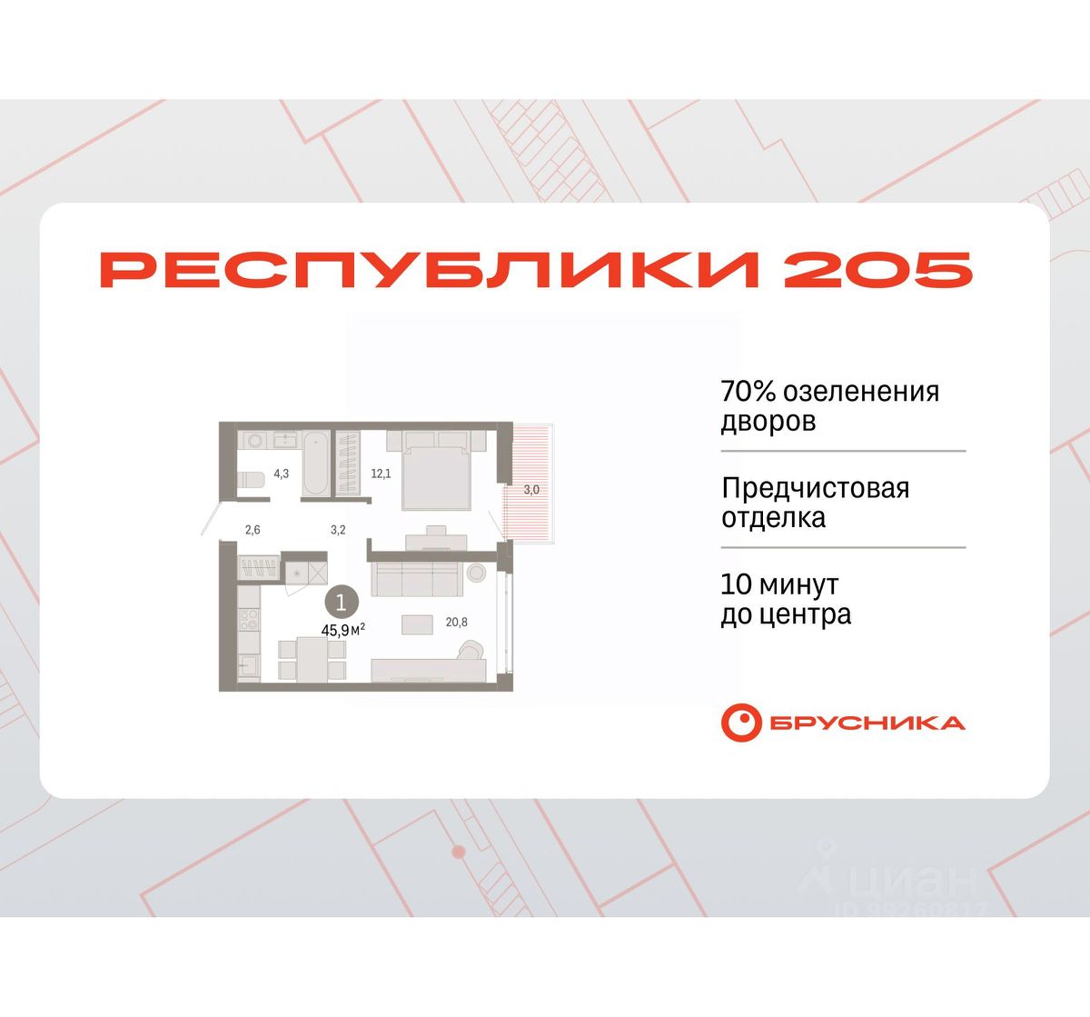 Продается однокомнатная квартира с предчистовой отделкой в ЖК "Республики 205" на 7 этаже. Общая площадь: 45.89 кв.м., жилая: 12.1 кв.м., площадь просторной кухни-гостиной: 20.8 кв.м. Все окна выходят на одну сторону. В квартире один балкон, один совмещенный санузел. Высота потолков 2.7 м.