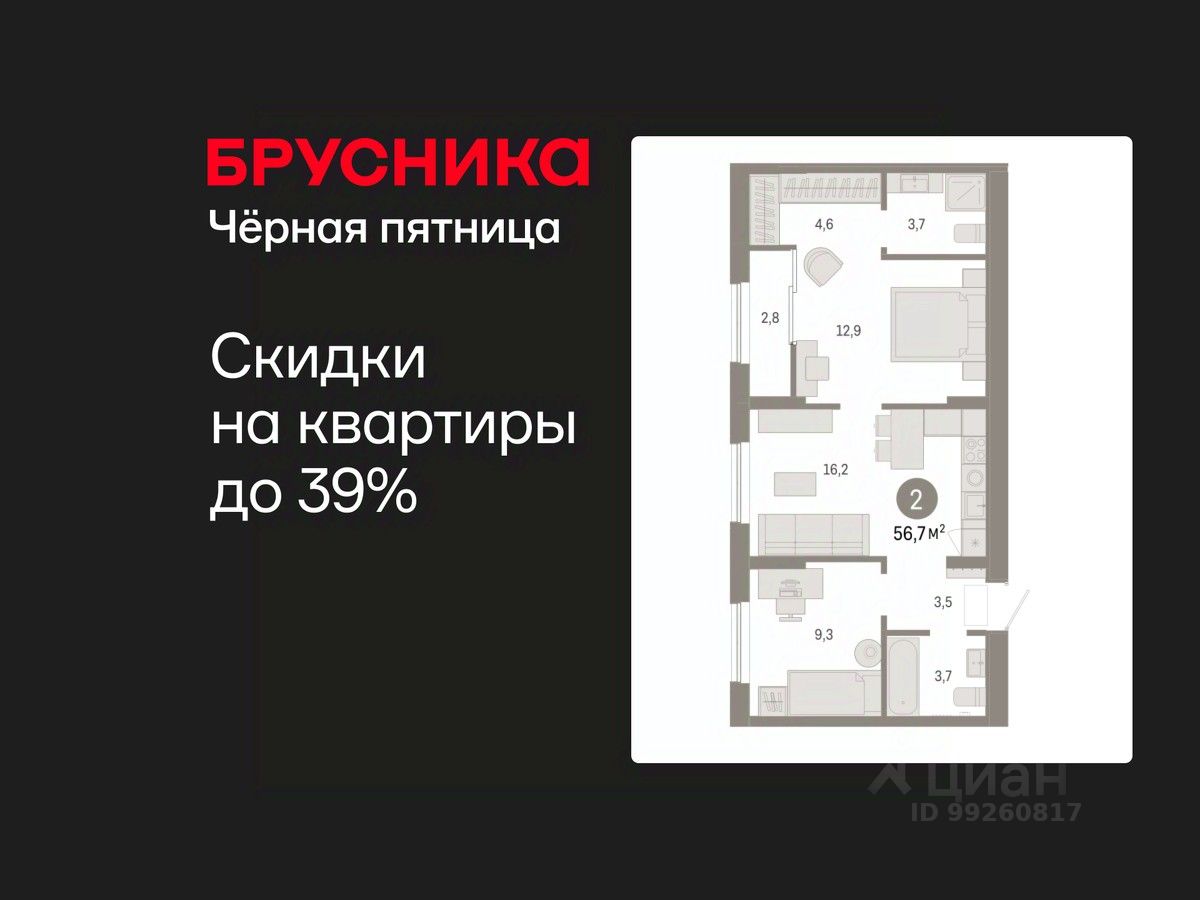 Квартира с кухней-гостиной и двумя спальнями в Октябрьском на Туре. Особенности планировки: гардеробная, вид во двор, тёплая лоджия, разнесённые спальни, предчистовая отделка, мастер-спальня.