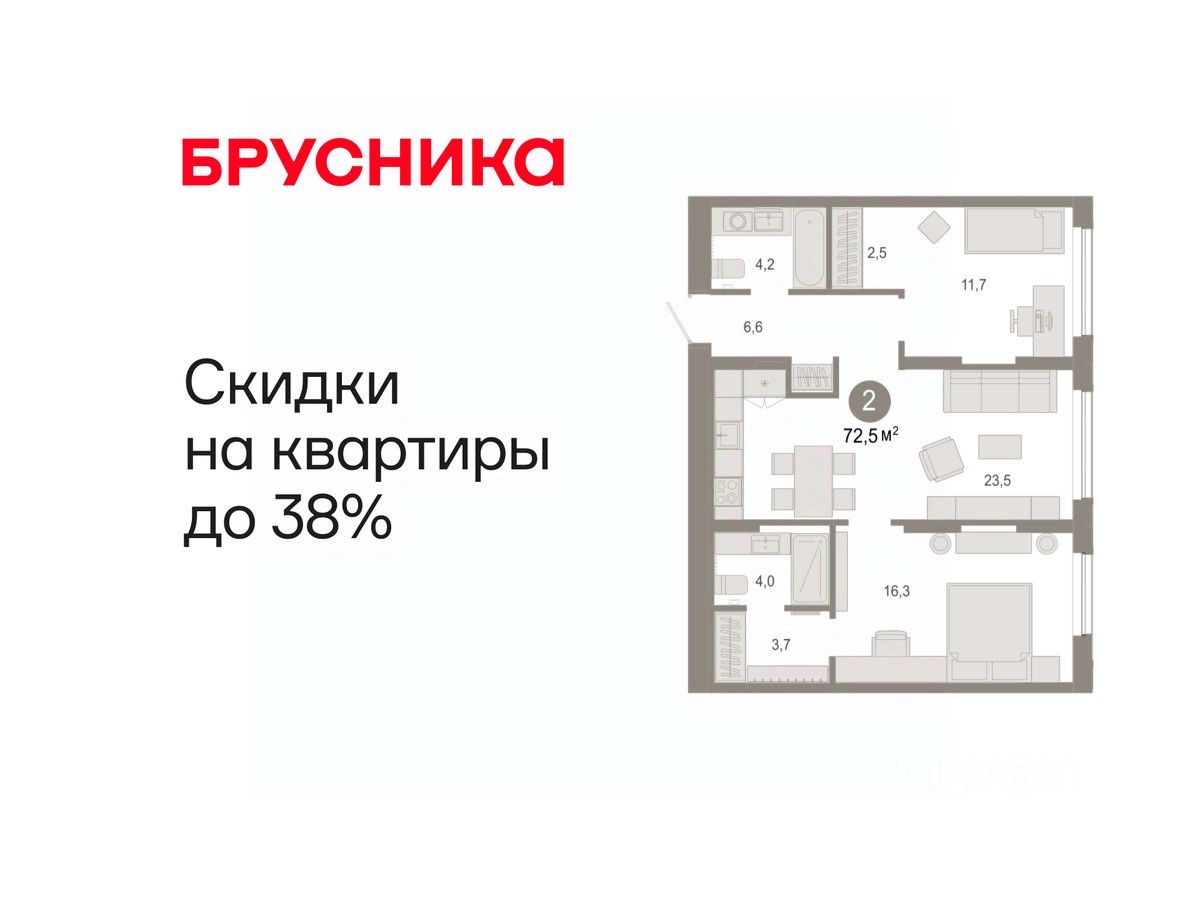 Квартира с кухней-гостиной и двумя спальнями в Октябрьском на Туре. Особенности планировки: вид во двор, гардеробная, мастер-спальня, предчистовая отделка, разнесённые спальни.