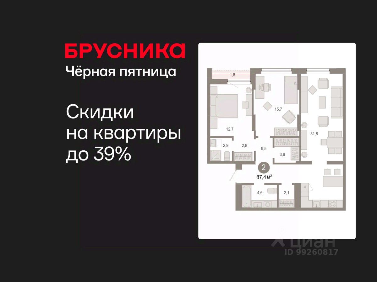 Квартира с кухней-гостиной и двумя спальнями в Октябрьском на Туре. Особенности планировки: гардеробная, лоджия, предчистовая отделка, мастер-спальня.