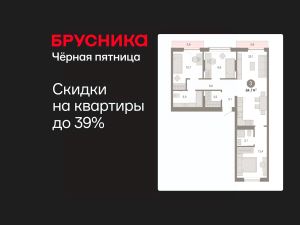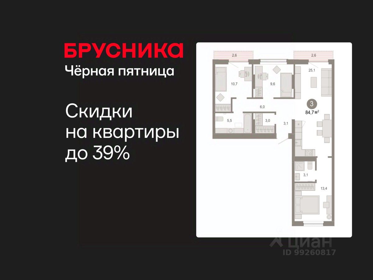 Квартира с кухней-гостиной и тремя спальнями в Октябрьском на Туре. Особенности планировки: гардеробная, вид во двор, разнесённые спальни, предчистовая отделка, мастер-спальня, балкон.
