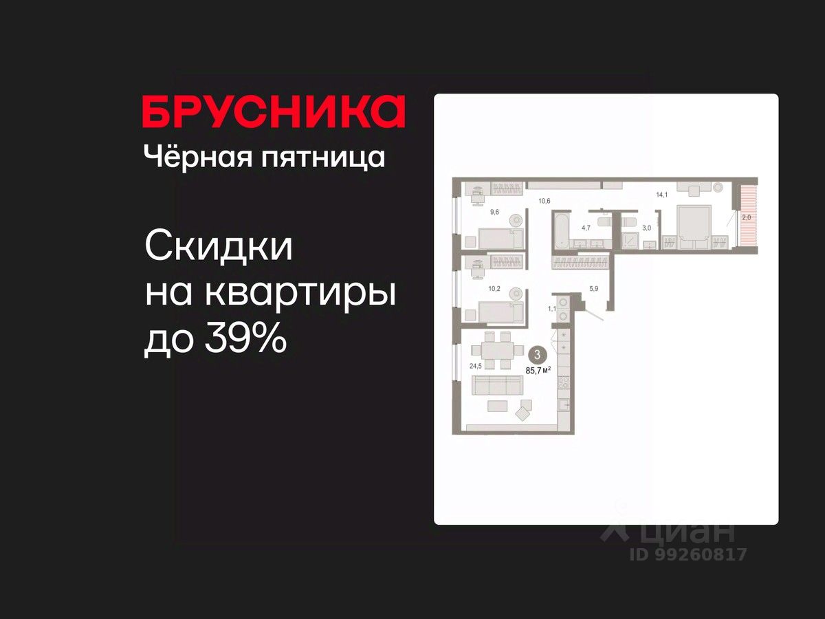 Квартира с кухней-гостиной и тремя спальнями в Октябрьском на Туре. Особенности планировки: вид во двор, лоджия, разнесённые спальни, предчистовая отделка, мастер-спальня, постирочная.