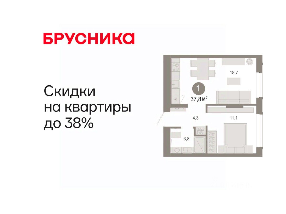 Квартира с кухней-гостиной и одной спальней в Октябрьском на Туре. Особенности планировки: предчистовая отделка.