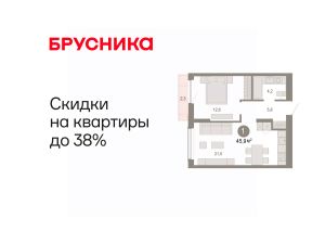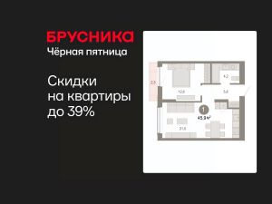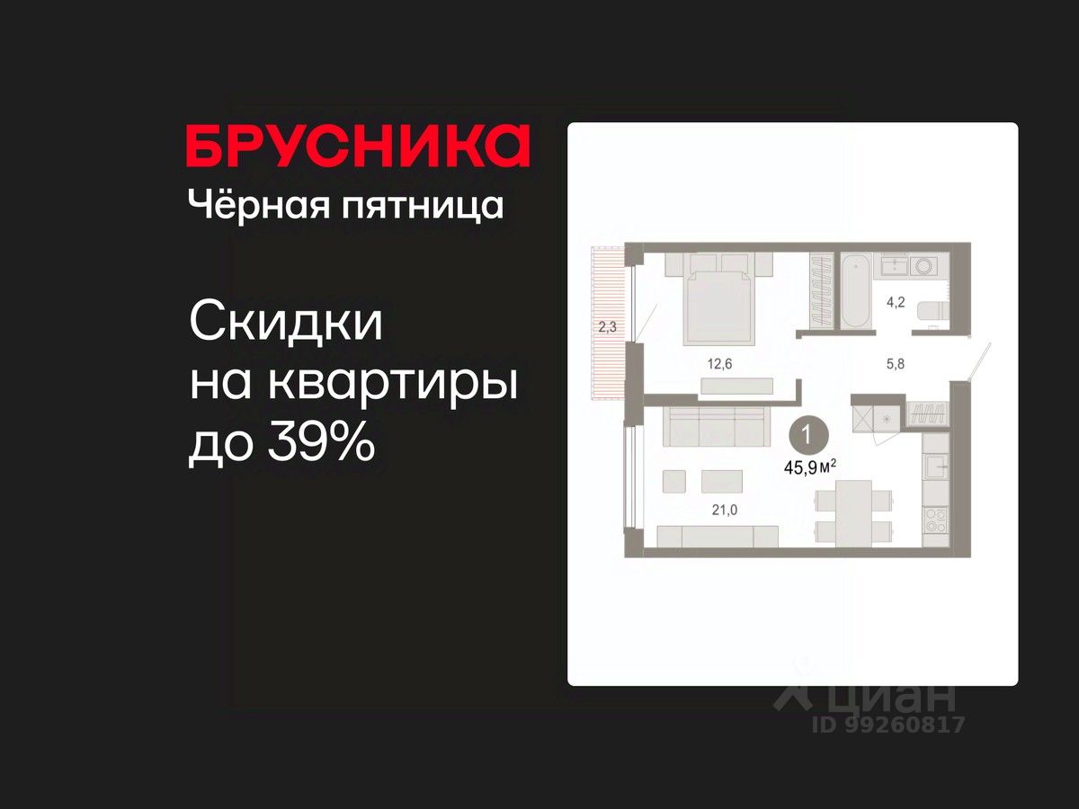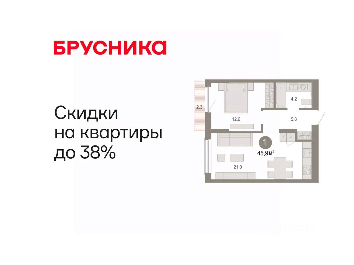 Квартира с кухней-гостиной и одной спальней в Октябрьском на Туре. Особенности планировки: предчистовая отделка, балкон.
