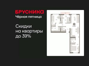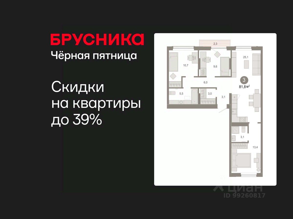 Квартира с кухней-гостиной и тремя спальнями в Октябрьском на Туре. Особенности планировки: гардеробная, вид во двор, разнесённые спальни, предчистовая отделка, мастер-спальня, балкон.