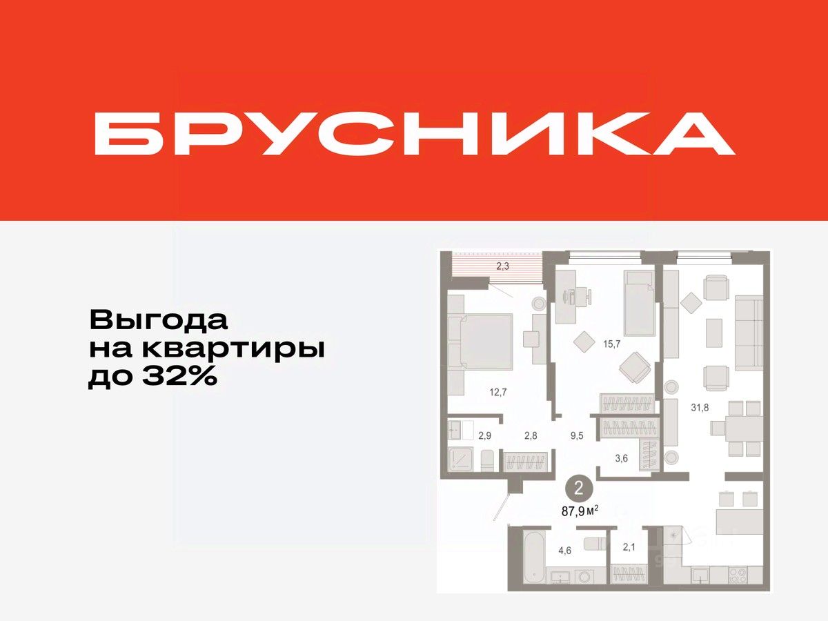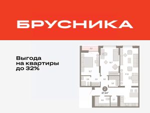 Квартира с кухней-гостиной и двумя спальнями в Октябрьском на Туре. Особенности планировки: гардеробная, лоджия, предчистовая отделка, мастер-спальня.