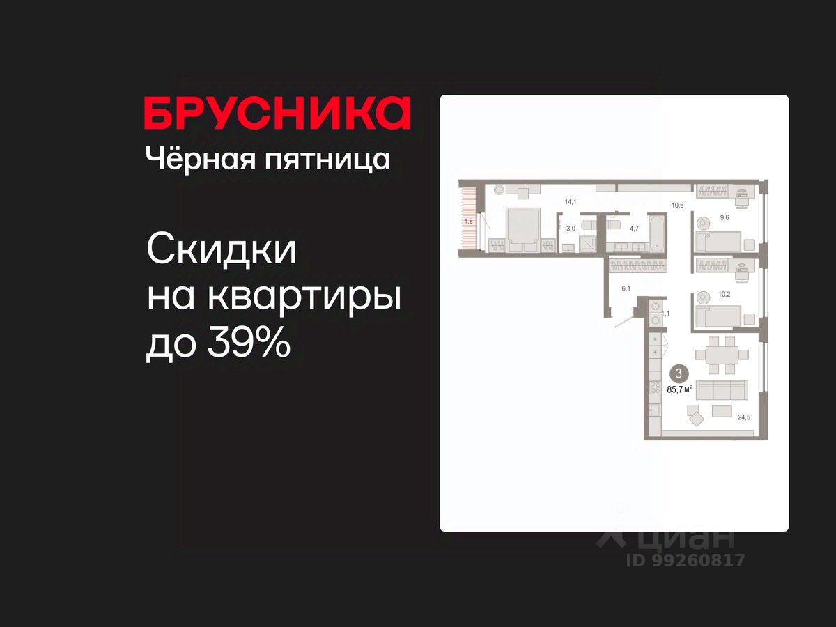 Квартира с кухней-гостиной и тремя спальнями в Октябрьском на Туре. Особенности планировки: вид во двор, лоджия, разнесённые спальни, предчистовая отделка, мастер-спальня, постирочная.