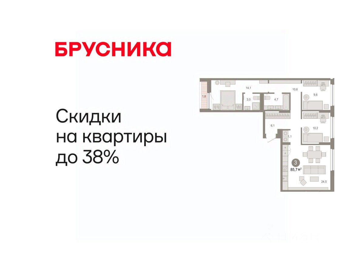 Квартира с кухней-гостиной и тремя спальнями в Октябрьском на Туре. Особенности планировки: вид во двор, лоджия, мастер-спальня, постирочная, предчистовая отделка, разнесённые спальни.