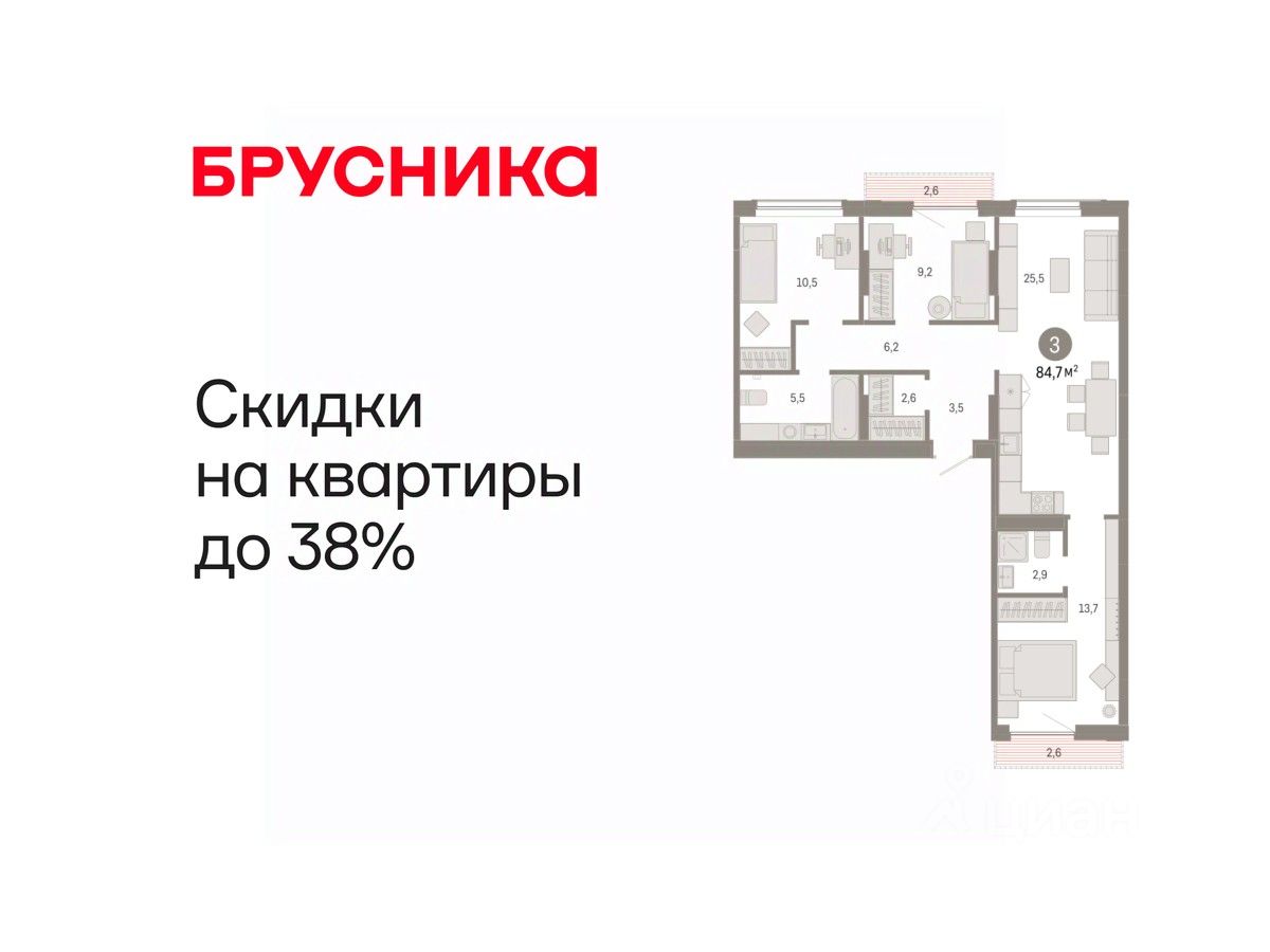 Квартира с кухней-гостиной и тремя спальнями в Октябрьском на Туре. Особенности планировки: мастер-спальня, предчистовая отделка.
