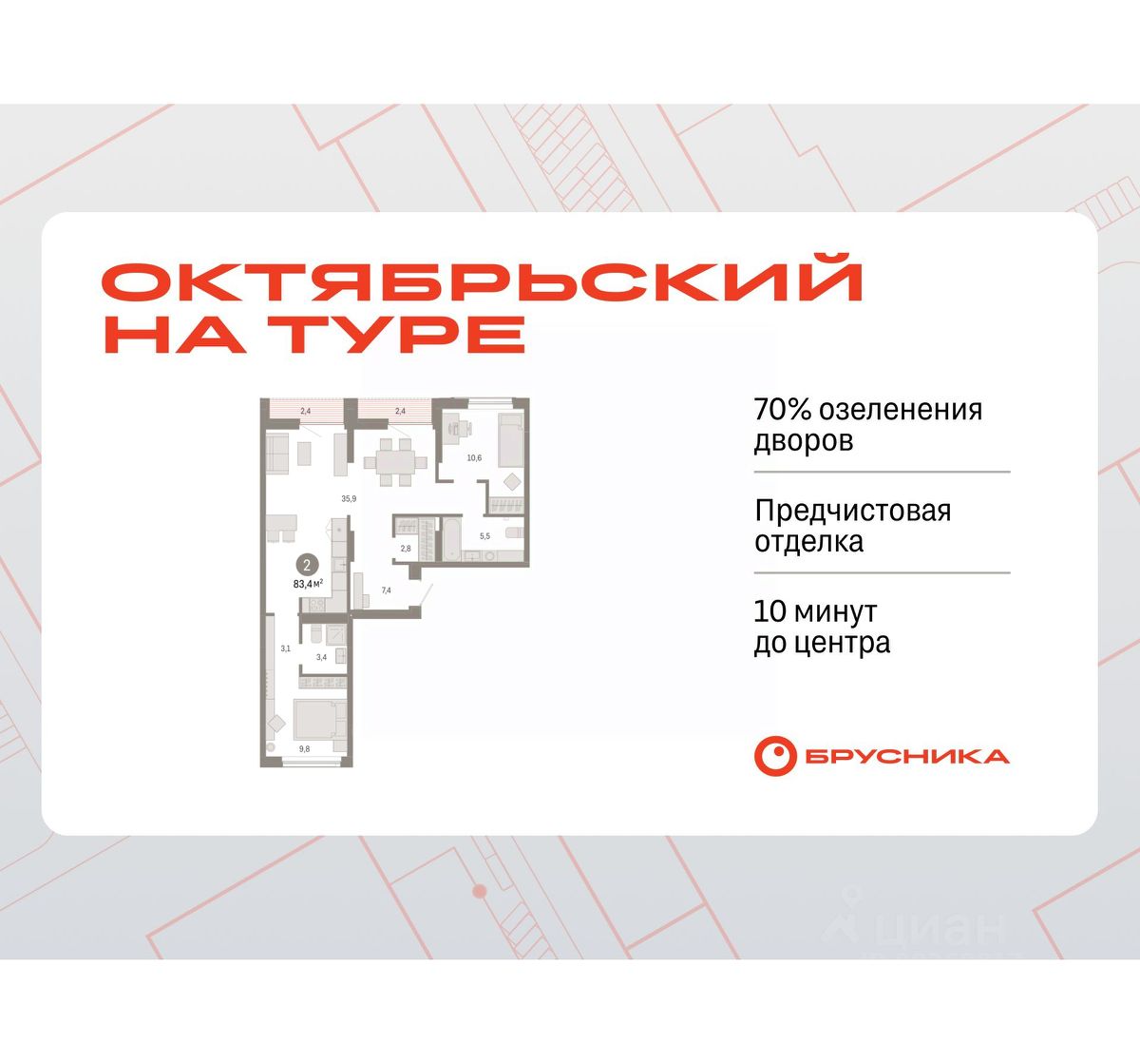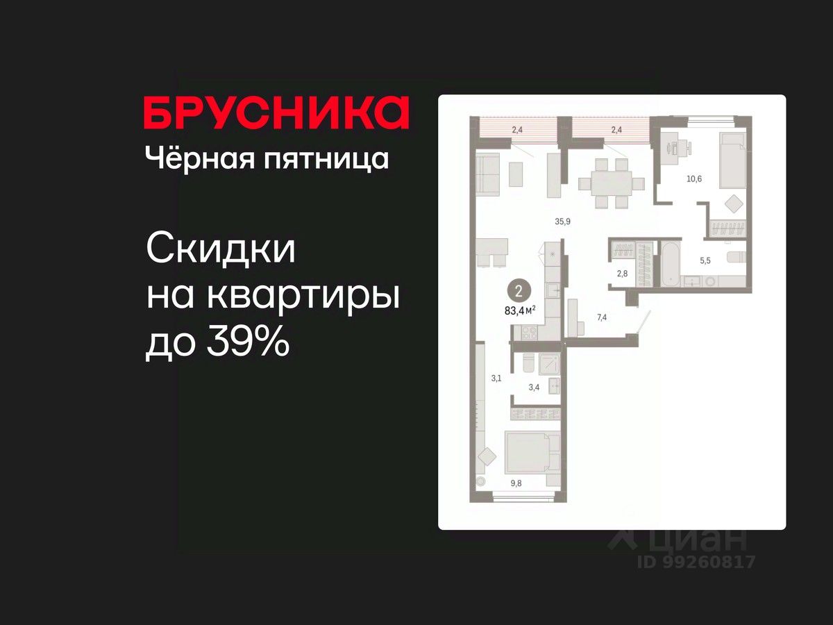 Квартира с кухней-гостиной и двумя спальнями в Октябрьском на Туре. Особенности планировки: вид во двор, лоджия, разнесённые спальни, предчистовая отделка, мастер-спальня.