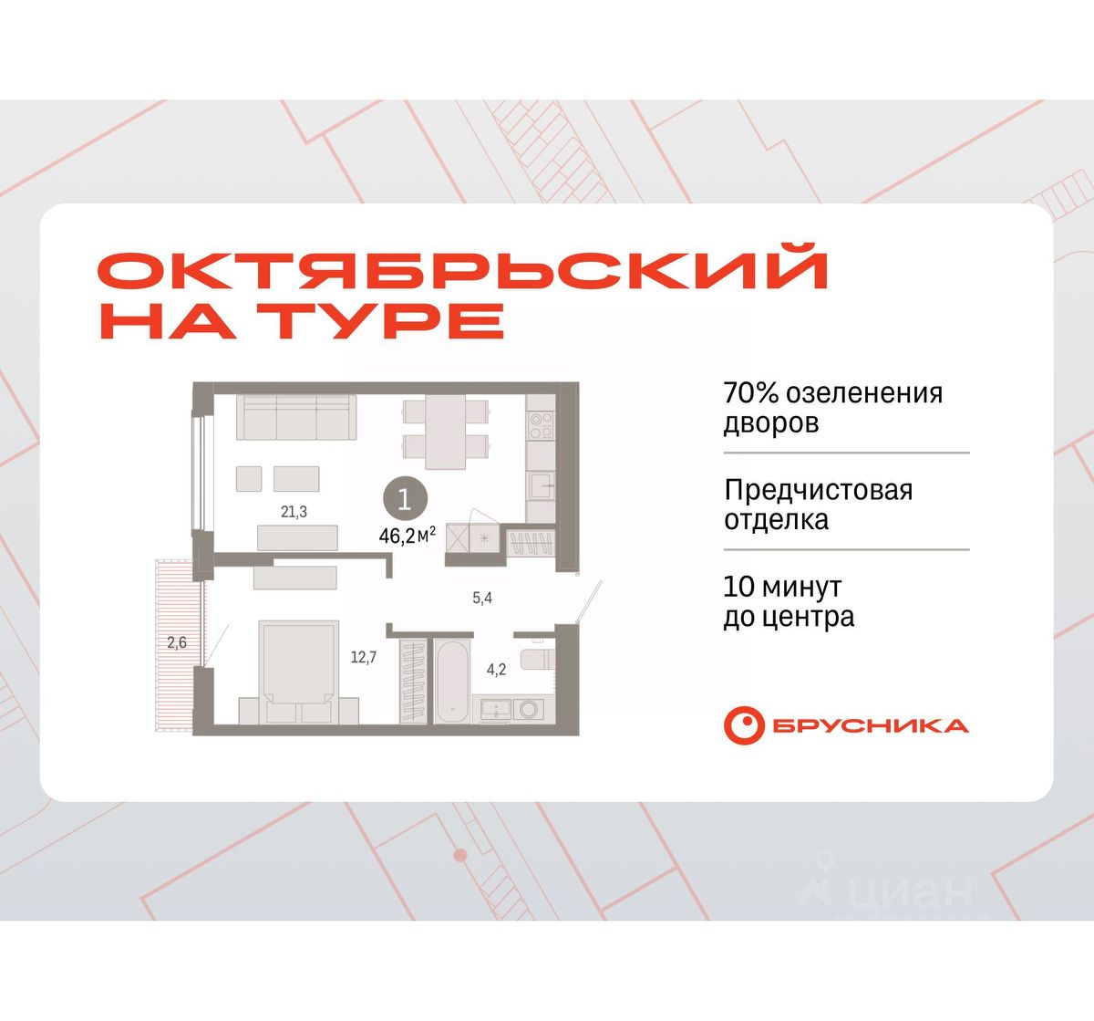 Квартира с кухней-гостиной и одной спальней в Октябрьском на Туре. Особенности планировки: предчистовая отделка, балкон.