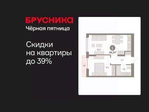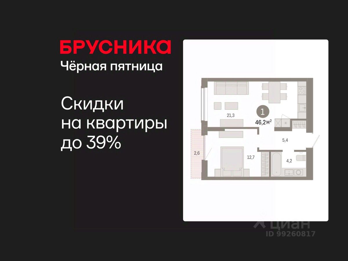 Квартира с кухней-гостиной и одной спальней в Октябрьском на Туре. Особенности планировки: предчистовая отделка, балкон.