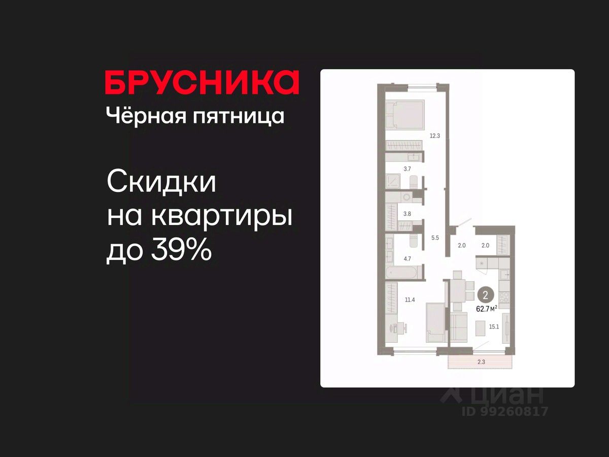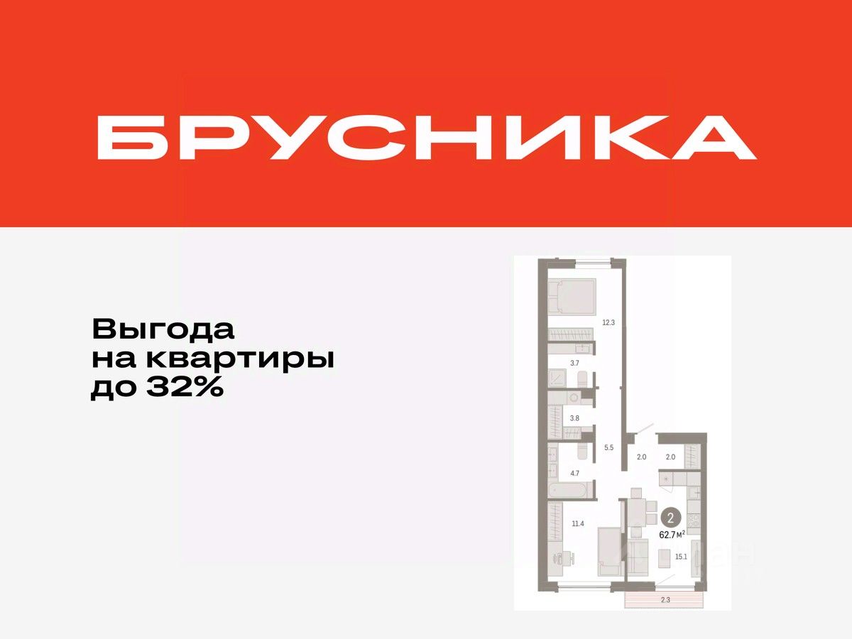 Квартира с кухней-гостиной и двумя спальнями в Октябрьском на Туре. Особенности планировки: второй санузел, гардеробная, вид во двор, разнесённые спальни, предчистовая отделка, мастер-спальня, постирочная, балкон.