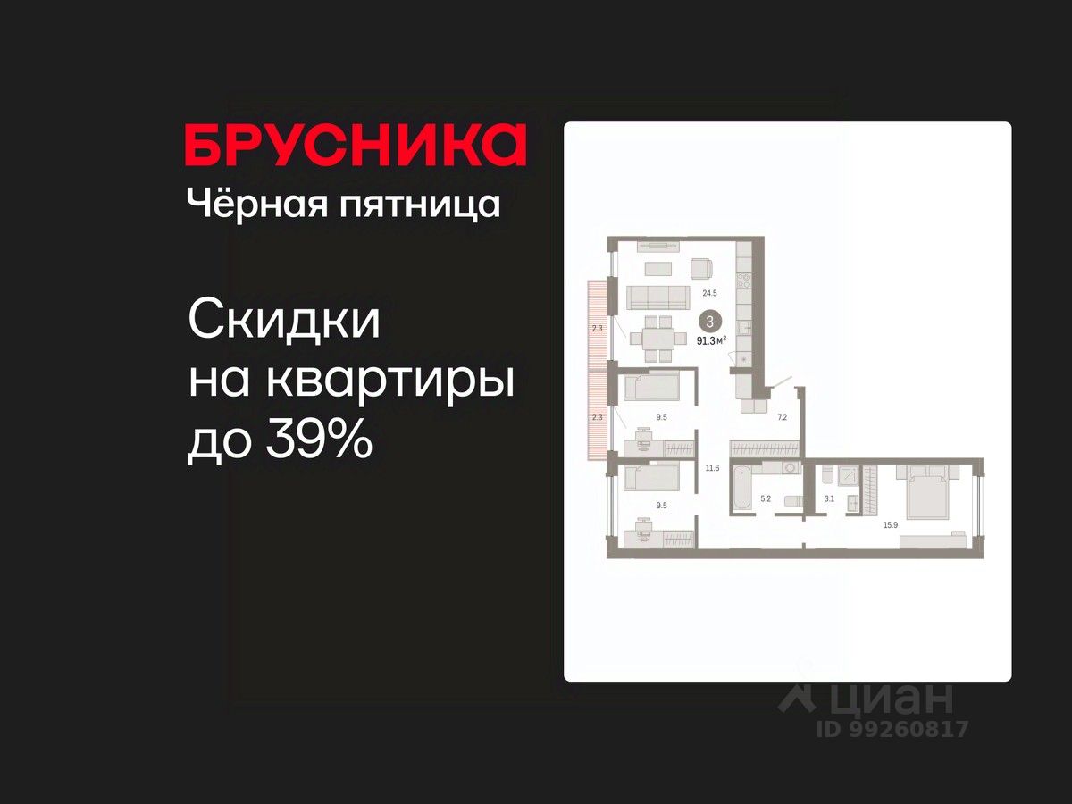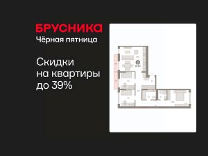 Квартира с кухней-гостиной и тремя спальнями в Октябрьском на Туре. Особенности планировки: вид во двор, разнесённые спальни, предчистовая отделка, мастер-спальня, балкон.
