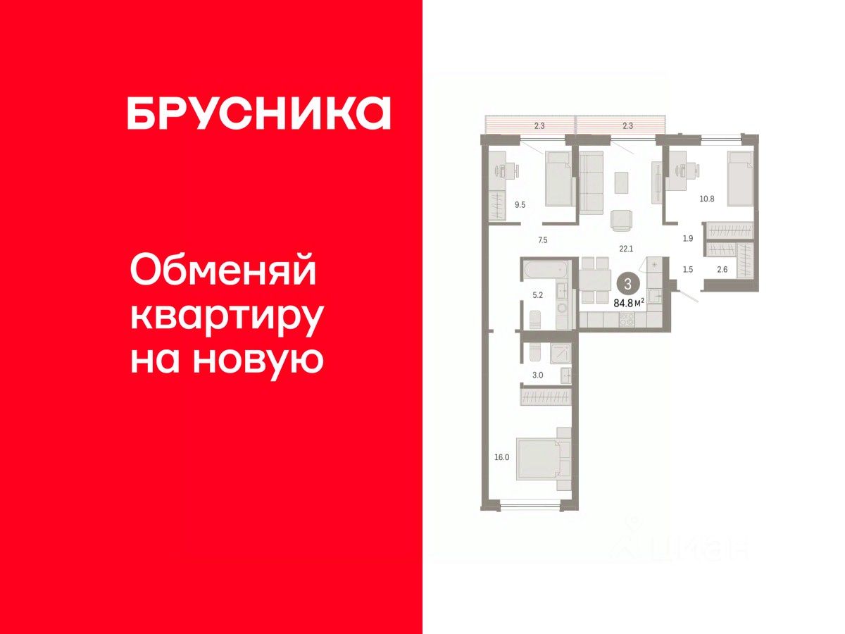 Квартира с кухней-гостиной и тремя спальнями в Октябрьском на Туре. Особенности планировки: балкон, вид во двор, гардеробная, мастер-спальня, предчистовая отделка, разнесённые спальни.