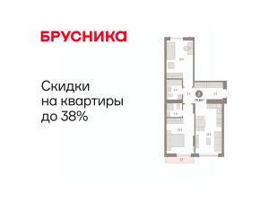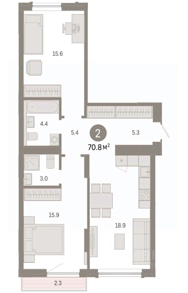 Квартира с кухней-гостиной и двумя спальнями в Октябрьском на Туре. Особенности планировки: второй санузел, гардеробная, вид во двор, разнесённые спальни, предчистовая отделка, мастер-спальня, балкон.