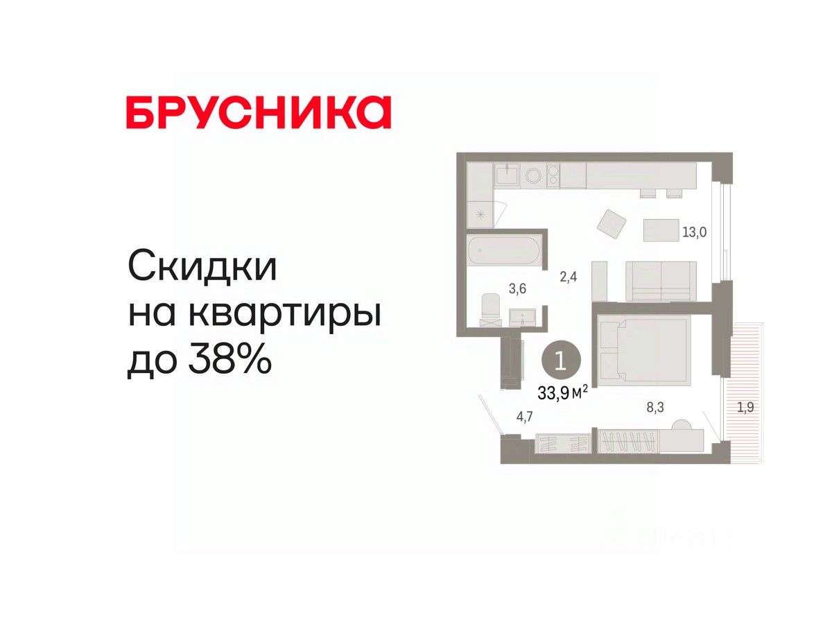 Квартира с кухней-гостиной и одной спальней в жилом районе "Зарека". Особенности планировки: предчистовая отделка, балкон.
