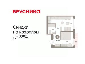 Продается однокомнатная квартира с предчистовой отделкой в ЖК "Зарека" на 10 этаже. Общая площадь: 33.85 кв.м., жилая: 8.3 кв.м., площадь просторной кухни-гостиной: 13 кв.м. Все окна выходят на одну сторону. В квартире один балкон, один совмещенный санузел. Высота потолков 2.7 м.