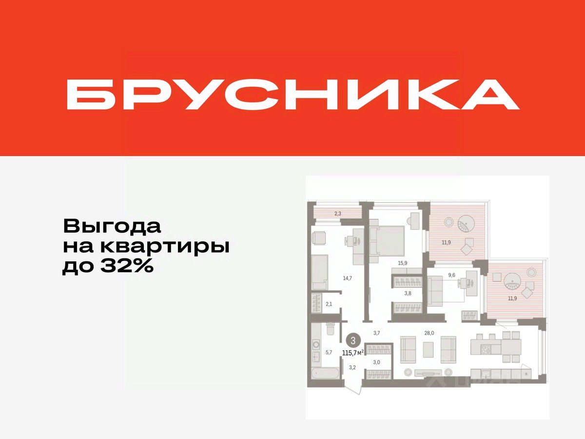 Квартира с кухней-гостиной и тремя спальнями в жилом районе "Зарека". Особенности планировки: гардеробная, предчистовая отделка, терраса на крыше.