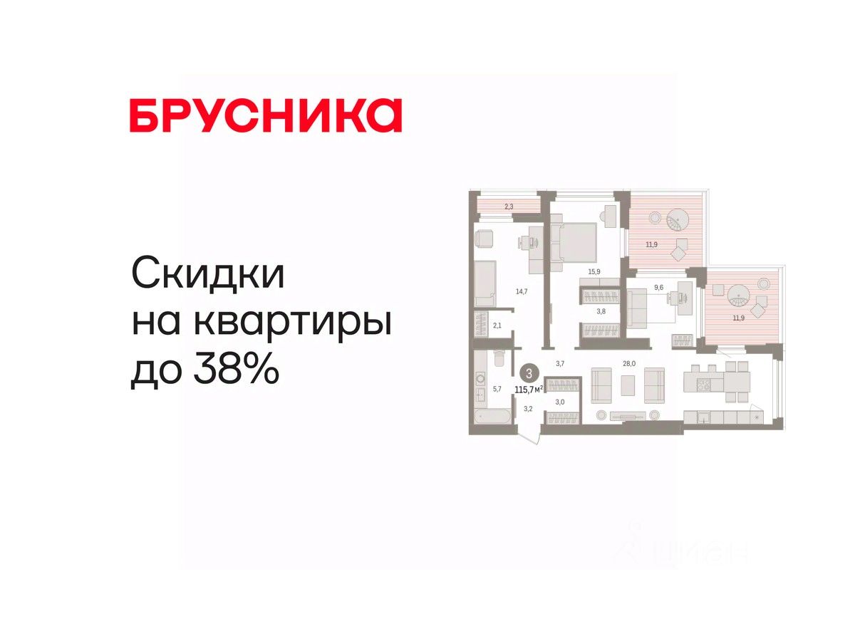 Продается 3-комн. квартира с предчистовой отделкой в ЖК "Зарека" на 13 этаже. Общая площадь: 115.7 кв.м. Высота потолков 2.7 м.