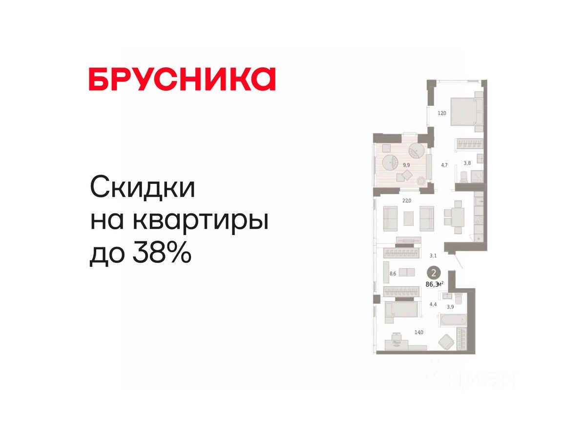 2-комн. квартира от застройщика с предчистовой отделкой в ЖК "Зарека" на 25 этаже. Общая площадь: 86.32 кв.м. Высота потолков 2.7 м.