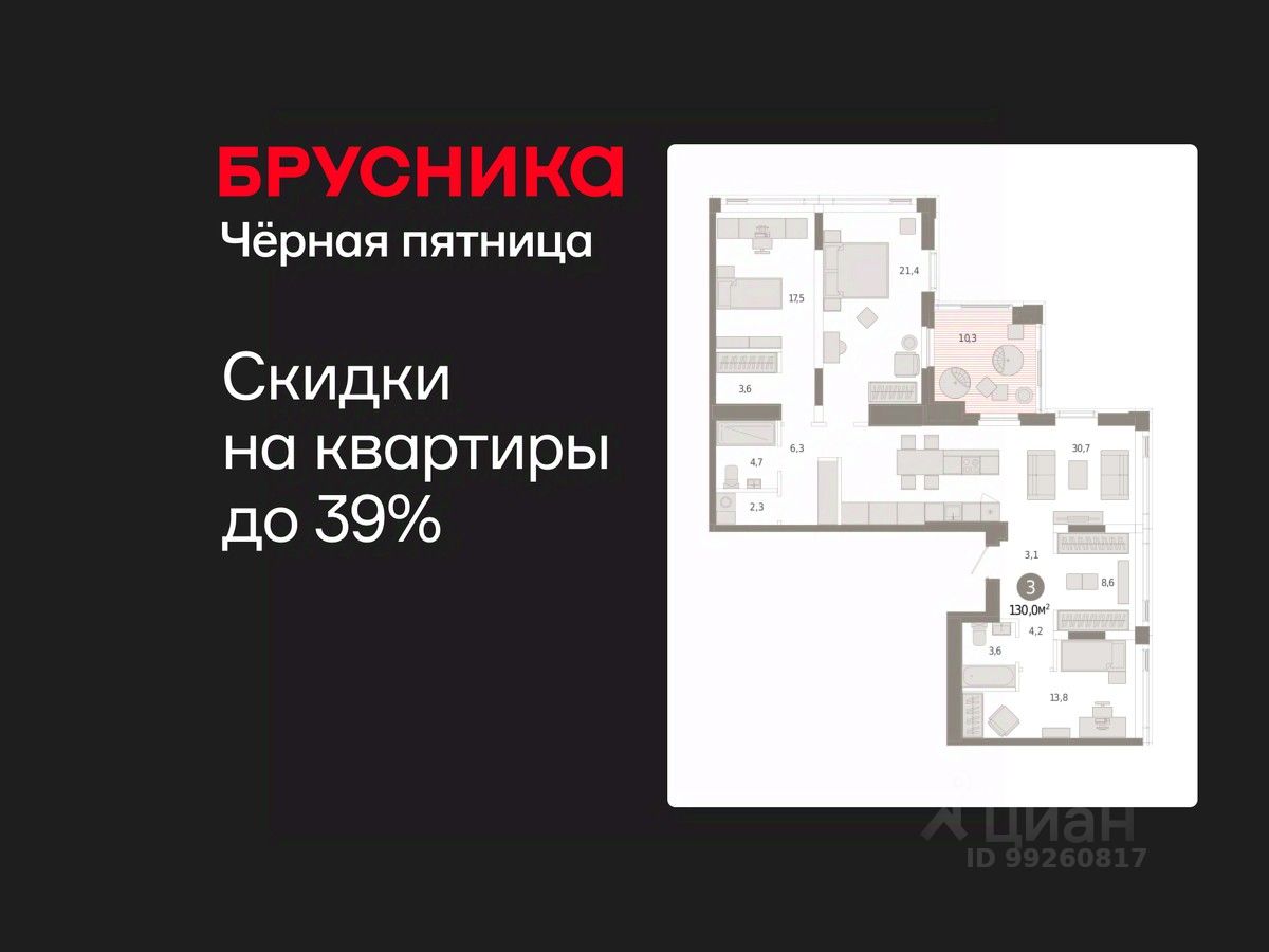 3-комн. квартира от застройщика с предчистовой отделкой в ЖК "Зарека" на 24 этаже. Общая площадь: 130 кв.м. Высота потолков 2.7 м.