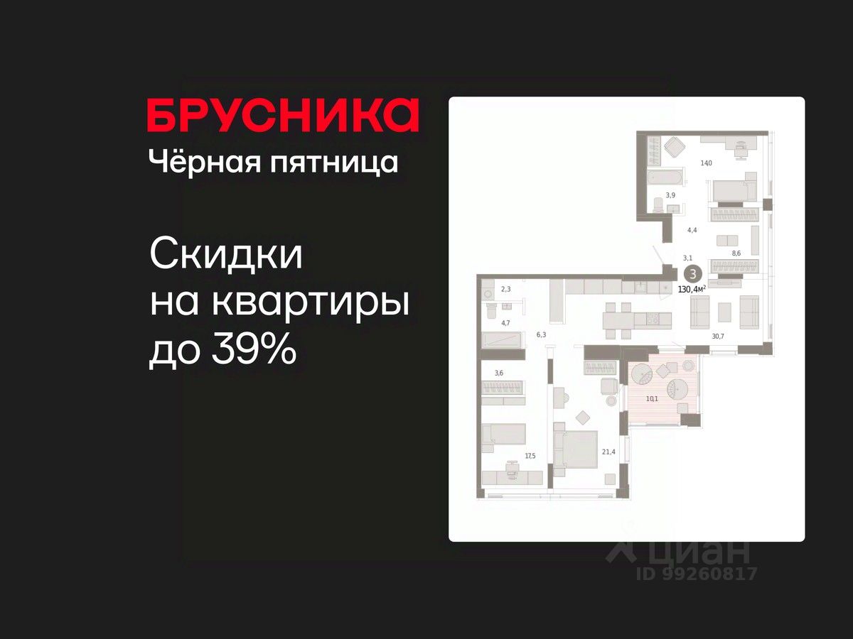 3-комн. квартира с предчистовой отделкой в ЖК "Зарека" на 24 этаже. Общая площадь: 130.42 кв.м. Высота потолков 2.7 м.